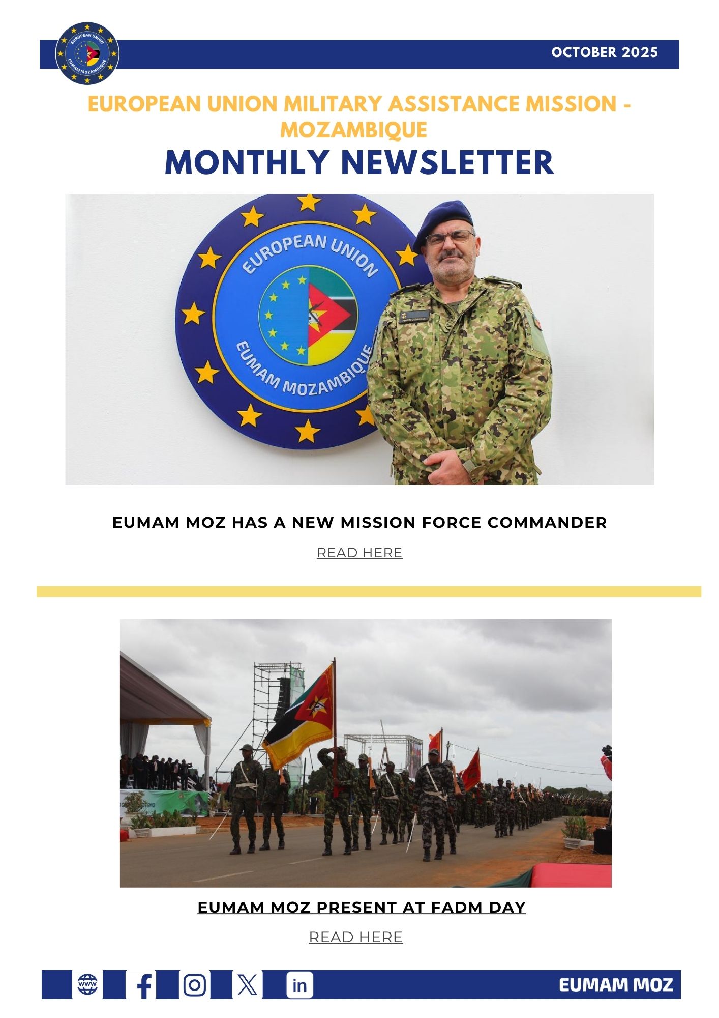 Breadcrumb EEAS EUMAM Mozambique EUMAM MOZ Newsletter October PRINT EUMAM MOZ Newsletter October 01.10.2025 We are very happy to share with you the first EUMAM Mozambique Newsletter for October 2025. Click on the hyperlinks to read more about all of our activities. See you next month for November Newsletter! File Newsletter October.pdf