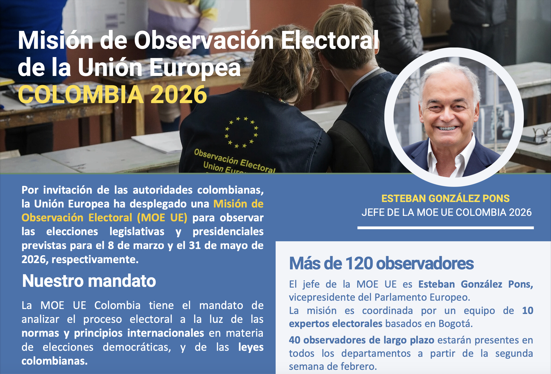Por invitación de las autoridades colombianas, la Unión Europea ha desplegado una Misión de Observación Electoral (MOE UE) para observar las elecciones legislativas y presidenciales previstas para el 8 de marzo y el 31 de mayo de 2026.