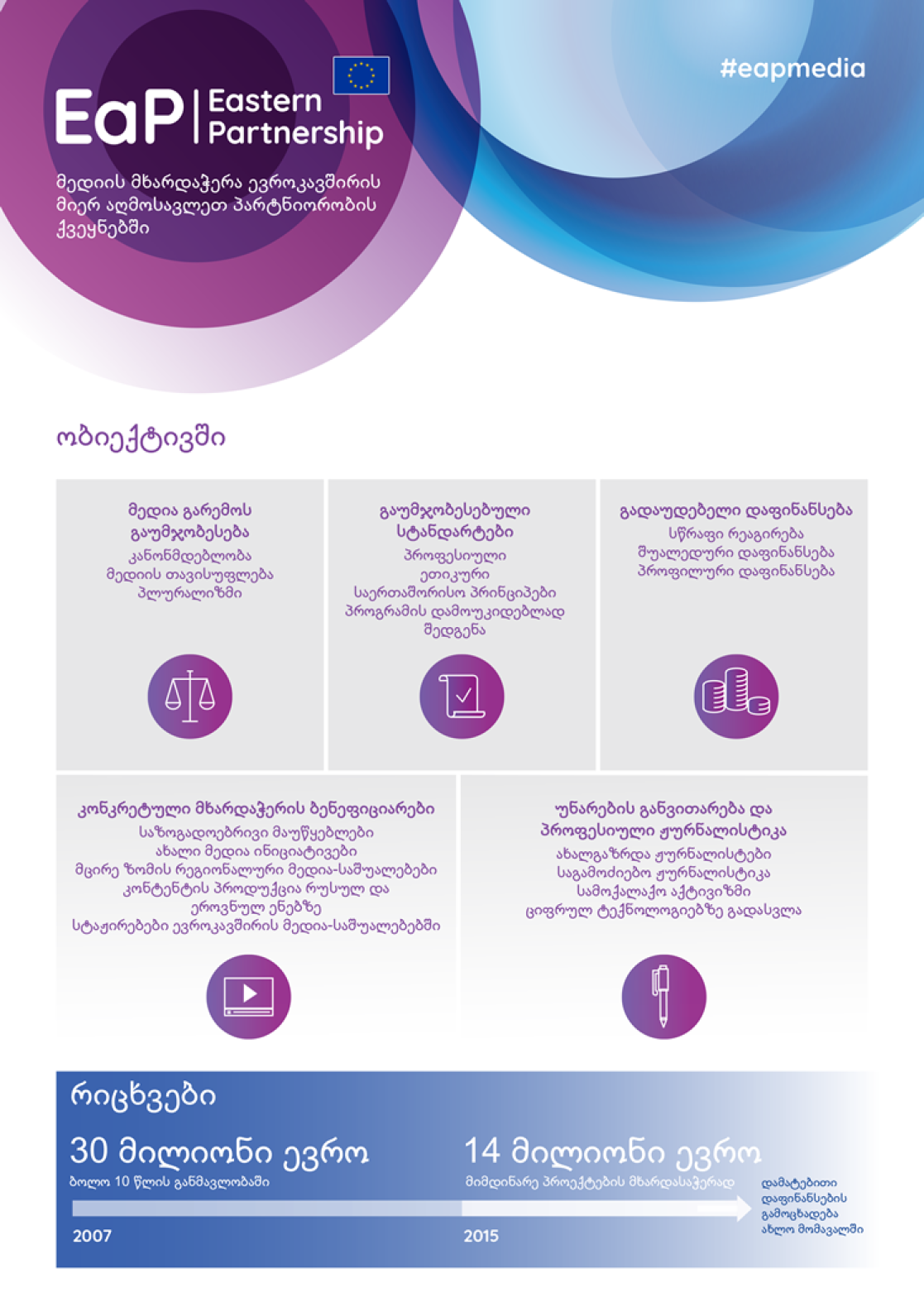გასული ათწლეულის განმავლობაში ევროკავშირმა დაახლოებით 30 მილიონი ევრო დახარჯა და გამოყო ასიგნებების სახით მედია ინიციატივების მხარდასაჭერად აღმოსავლეთ პარტნიორობის ქვეყნებში. დამოუკიდებელი ჟურნალისტიკა დემოკრატიული საზოგადოების განვითარების აუცილებელი პირობაა, ხოლო ევროკავშირი კვლავაც თავისუფალი და პლურალისტური მედია-გარემოს პრინციპების ზედმიწევნით ერთგულია მის სამეზობლოში.