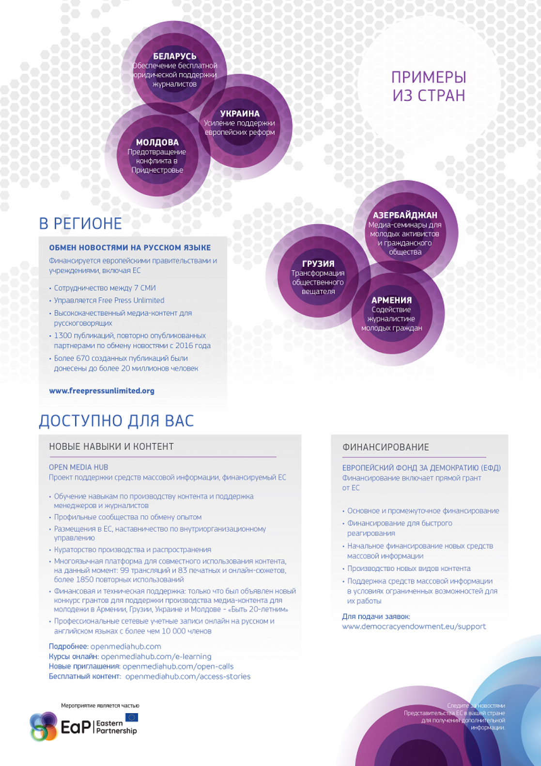 На протяжении последнего десятилетия Европейский союз потратил и выделил около 30 миллионов евро на поддержку инициатив в области средств массовой информации в восточных странах-партнерах. Независимая журналистика является необходимым условием развития демократического общества, и Европейский союз по-прежнему глубоко привержен свободе, независимости и плюралистическому медиа-пространству в своем соседстве.