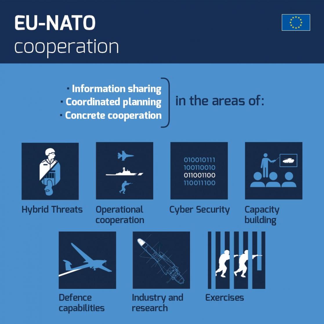 欧州連合(EU)と北大西洋条約機構(NATO)は、2016年の共同宣言の履行の一環として、34の新たな行動に取り組むことに合意した。これらの行動は、これまでの協力を深めるとともに、軍の動員、テロ対策における情報共有および平和と安全保障における女性の役割など新たなテーマに協力を拡大させる。