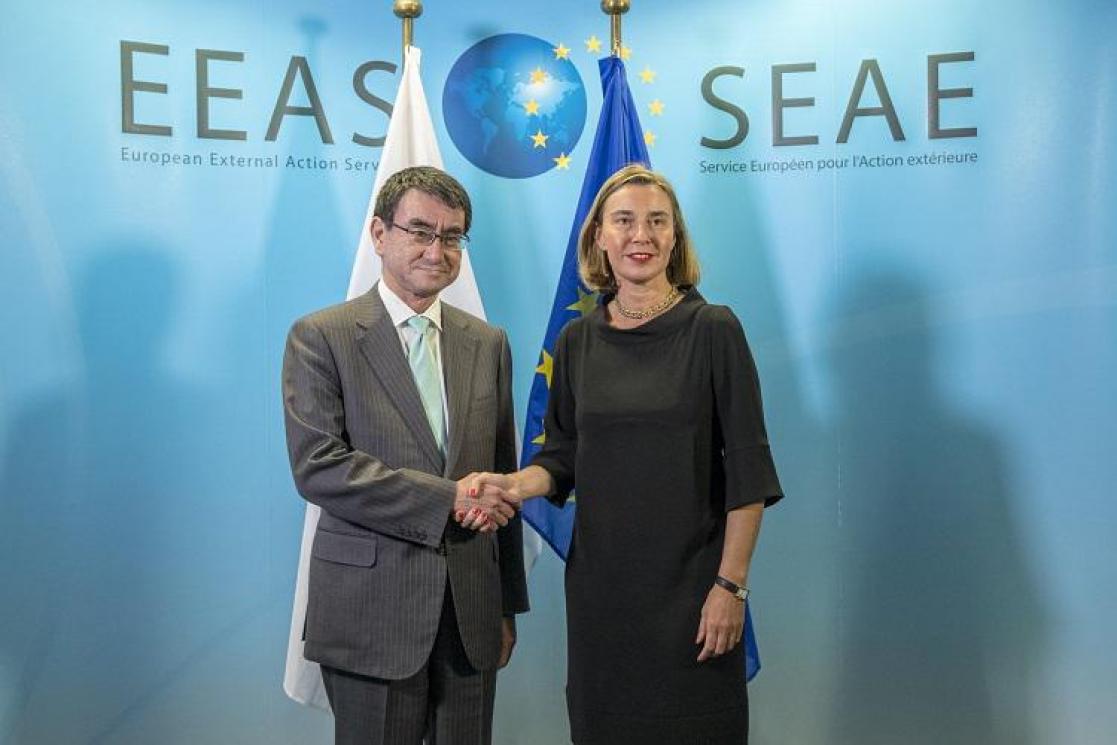 モゲリーニEU上級代表、河野外相と日・EU戦略的パートナーシップ協定交渉終了を受けて会合
