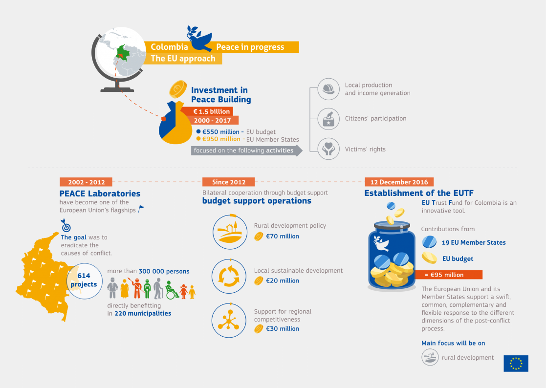 La Unión Europea, junto con el resto de la comunidad internacional, participó de manera importante en las negociaciones del proceso de paz y desde entonces ha apoyado la aplicación del acuerdo de paz. La UE designó un representante especial de la UE para el proceso de paz y, a finales de 2016, puso en marcha el Fondo Fiduciario de la UE para Colombia. El Fondo Fiduciario apoya la reconstrucción del tejido social y económico del país y crea nuevas esperanzas para los ciudadanos de Colombia, sobre todo en las zonas rurales, que son las más afectadas por el conflicto.