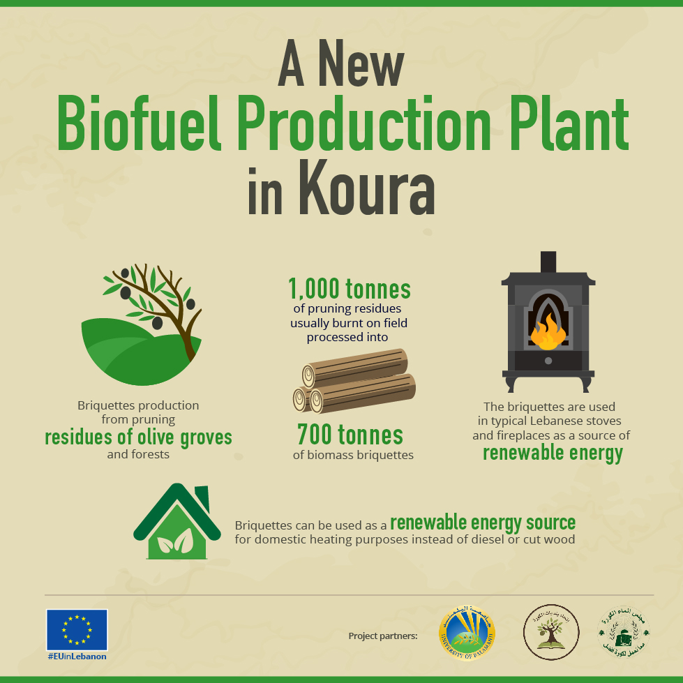 As part of its effort to help Lebanon increase its renewable energy production, the EU has financed the construction of a new biomass briquettes production plant in North Lebanon's Koura. The plant produces briquettes from pruning residues of olive groves and public forests. The project provides support to the Koura Union of Municipalities in facing energy sustainability challenges. The briquettes are used in typical Lebanese stoves and fireplaces as a source of renewable energy.