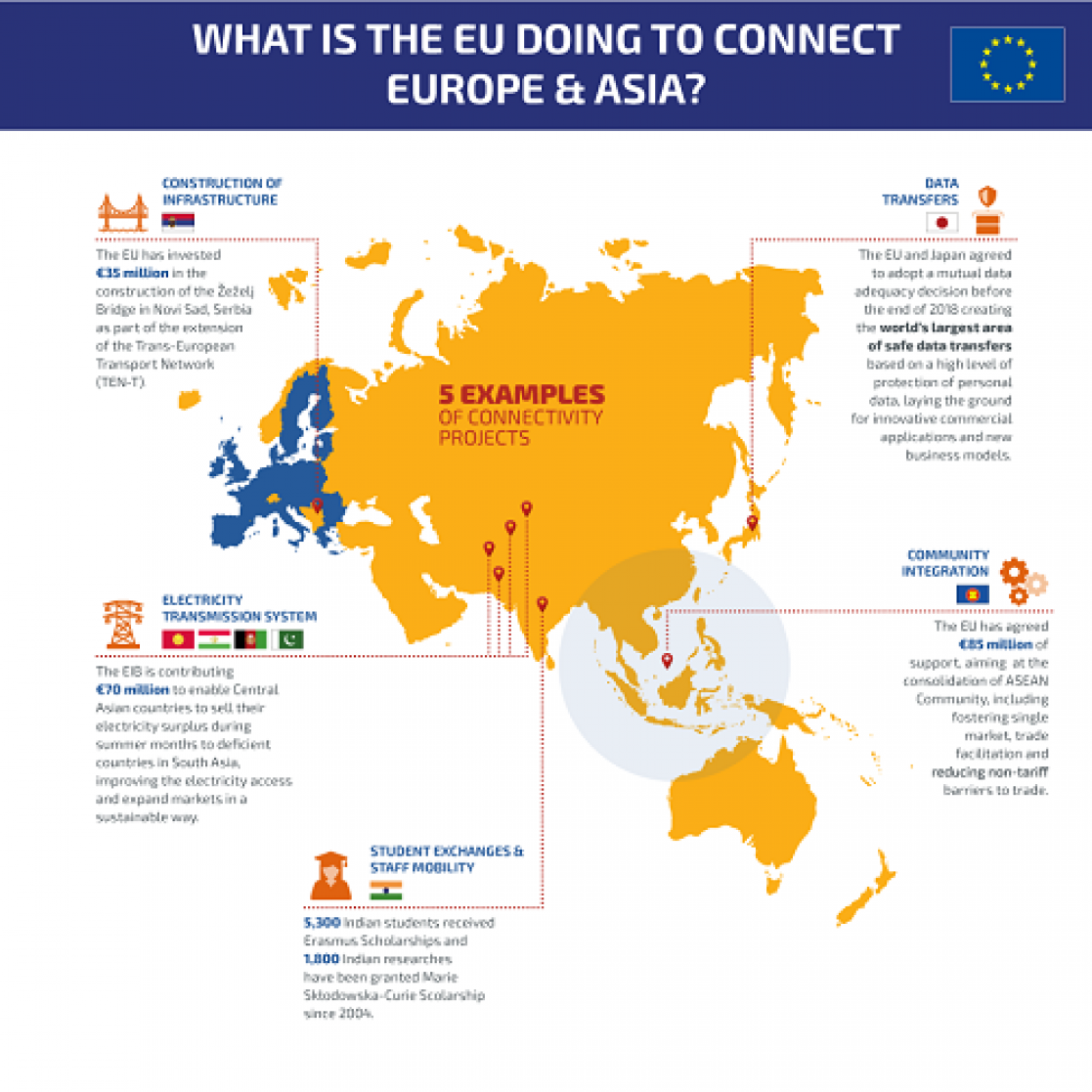 The EU's Trans-European Transport Networks (TEN-T) are being extended to countries bordering Asia. The EU should now connect the TEN-T with networks in Asia. The EU's digital single market provides a blueprint for enhancing trade in digital services, while its Digital4Development strategy fosters socioeconomic development. We will share our experience of creating regional, liberalised energy markets with a focus on market-driven transformation towards clean energy. We will continue to promote human exchanges and mobility, for example in education, research, innovation, culture and tourism.