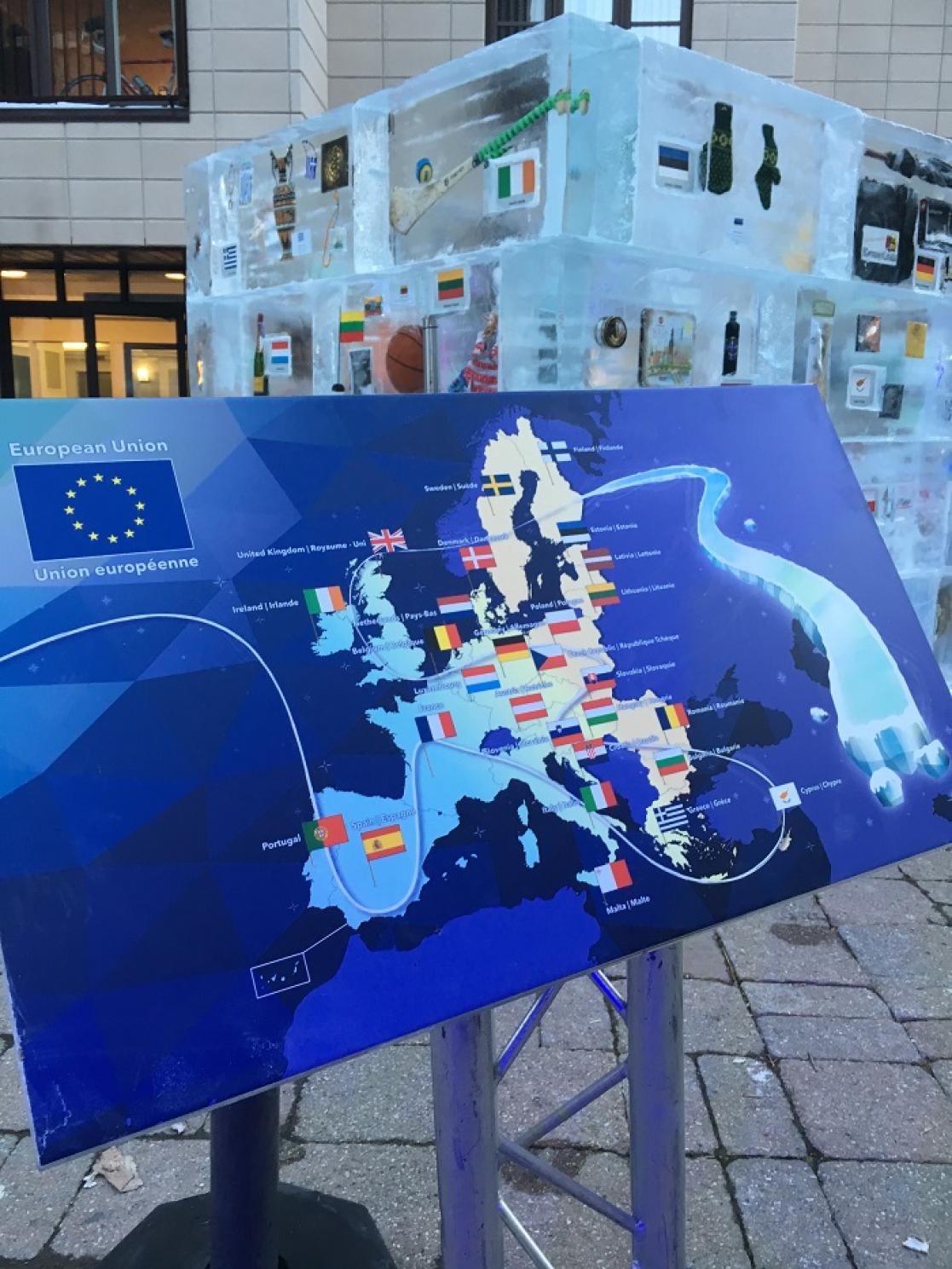 The EU ice sculpture showcases Europe's cultural diversity, Europe's family of cultures through a display of everyday objects symbolic of EU Member States. On 10 February, the public is invited to break the ice blocks and retrieve the objects for keepsake.