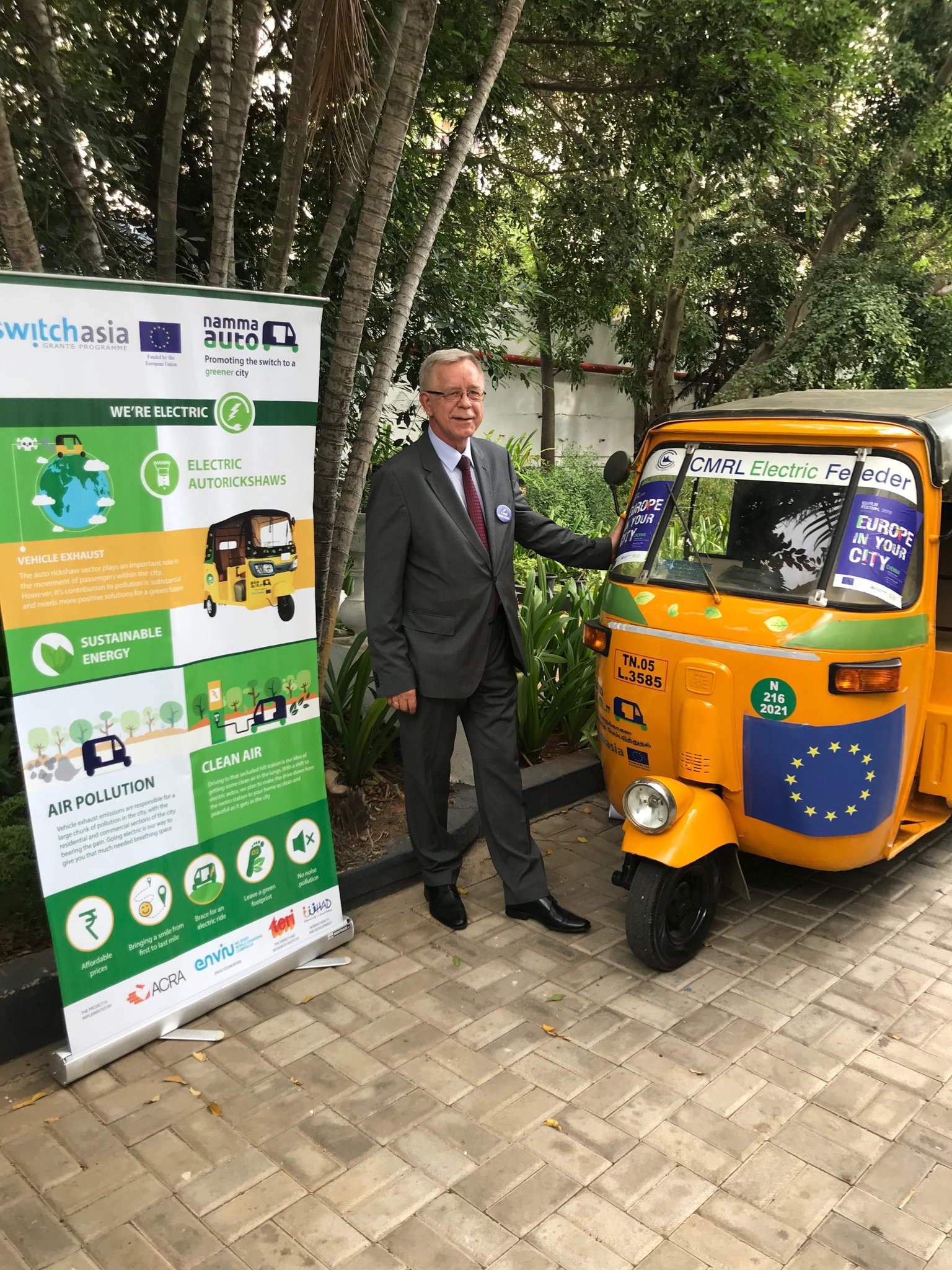 In light of its commitment to battling climate change, the EU cooperates with India on clean energy and green mobility. Mr. Kozlowski showcased electric three wheelers promoted by the EU-supported ‘Namma Auto Project’ that were launched in 2019 to promote the shift to less polluting auto-rickshaws in Bangalore and Chennai. Electrification of vehicles helps reduce the dependence on non-renewable resources and creates cleaner cities. In addition to regular dialogue with the authorities to create an ecosystem that promotes the usage of electric 3-wheelers among the drivers and customers alike, the project pioneered the process of registering the first set of electric auto-rickshaws in Chennai. It also collaborated with Chennai Metro Rail Ltd. to pilot electric auto-rickshaws as Metro Rail Feeder Service.
